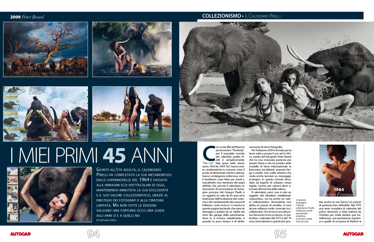 soprattutto, non risentono dei segni dell’età. Già, perché il calendario, lo strumento di promozione di immagine principe del Gruppo Pirelli, è un oggetto di culto da 45 anni ed è testimone dell’evoluzione del costume e del cambiamento dei canoni di bellezza, come Autocar vi mostra in queste pagine lasciando che siano le immagini a parlare da sé. Infatti dai muri dei garage delle autorimesse, dove lo si trovava inizialmente, è passato in poco tempo e di diritto