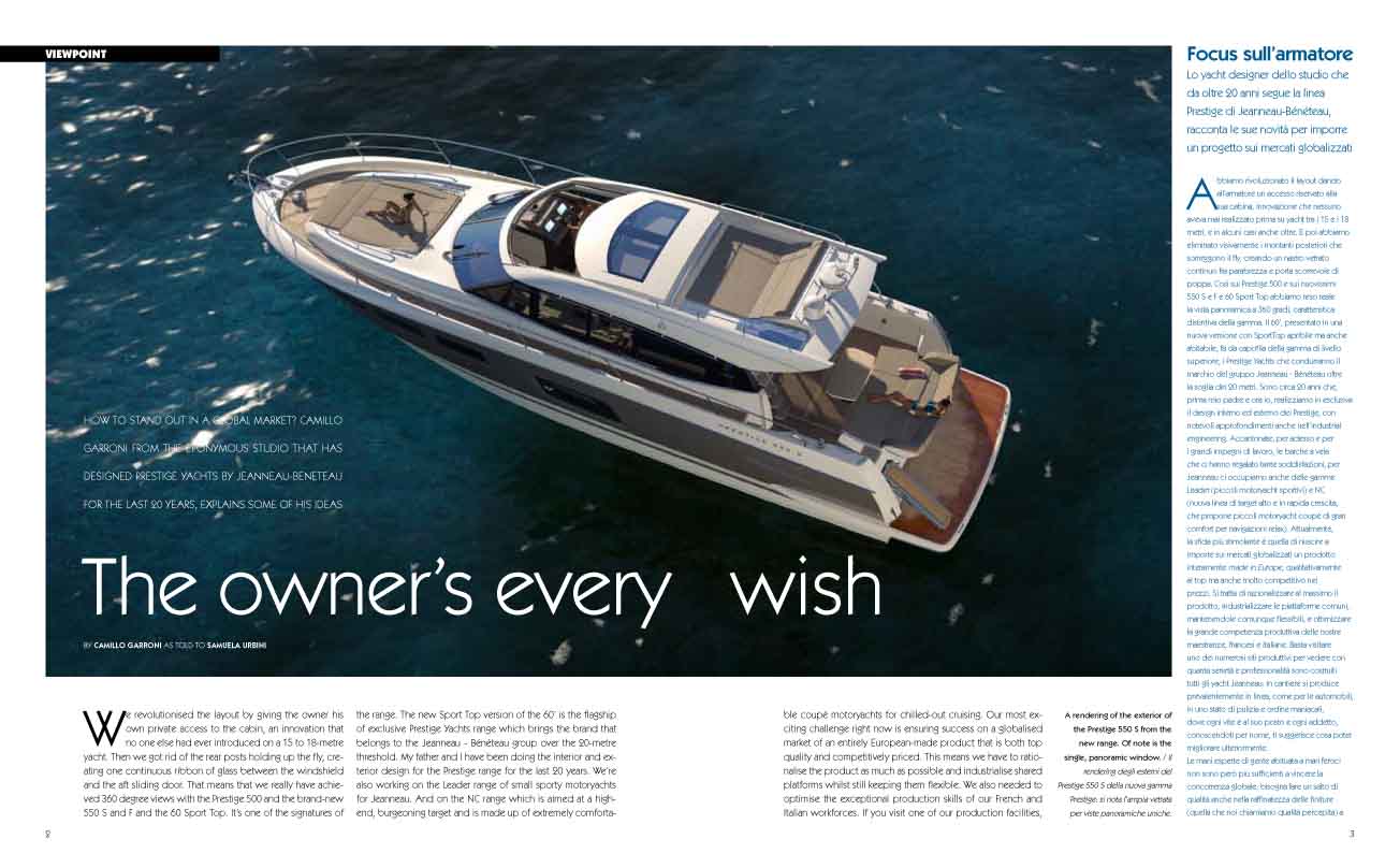 Parla lo yacht designer Camillo Garroni: “Abbiamo rivoluzionato il layout dando all’armatore un accesso riservato alla sua cabina, innovazione che nessuno aveva mai realizzato prima su yacht tra i 15 e i 18 metri, e in alcuni casi anche oltre. E poi abbiamo eliminato visivamente i montanti posteriori che sorreggono il fly, creando un nastro vetrato continuo fra parabrezza e porta scorrevole di poppa. Così sui Prestige 500 e sui nuovissimi 550 S e F e 60 Sport Top abbiamo reso reale la vista panoramica a 360 gradi, caratteristica distintiva della gamma. Il 60’, presentato in una nuova versione con SportTop apribile ma anche abitabile, fa da capofila della gamma di livello superiore, i Prestige Yachts che condurranno il marchio del gruppo Jeanneau – Bénéteau oltre la soglia dei 20 metri. Sono circa 20 anni che, prima mio padre e ora io, realizziamo in esclusiva il design interno ed esterno dei Prestige, con notevoli approfondimenti anche nell’industrial engineering. Accantonate, per adesso e per i grandi impegni di lavoro, le barche a vela che ci hanno regalato tante soddisfazioni, per Jeanneau ci occupiamo anche delle gamme Leader (piccoli motoryacht sportivi) e NC (nuova linea di target alto e in rapida crescita, che propone piccoli motoryacht coupé di gran comfort per navigazioni relax).